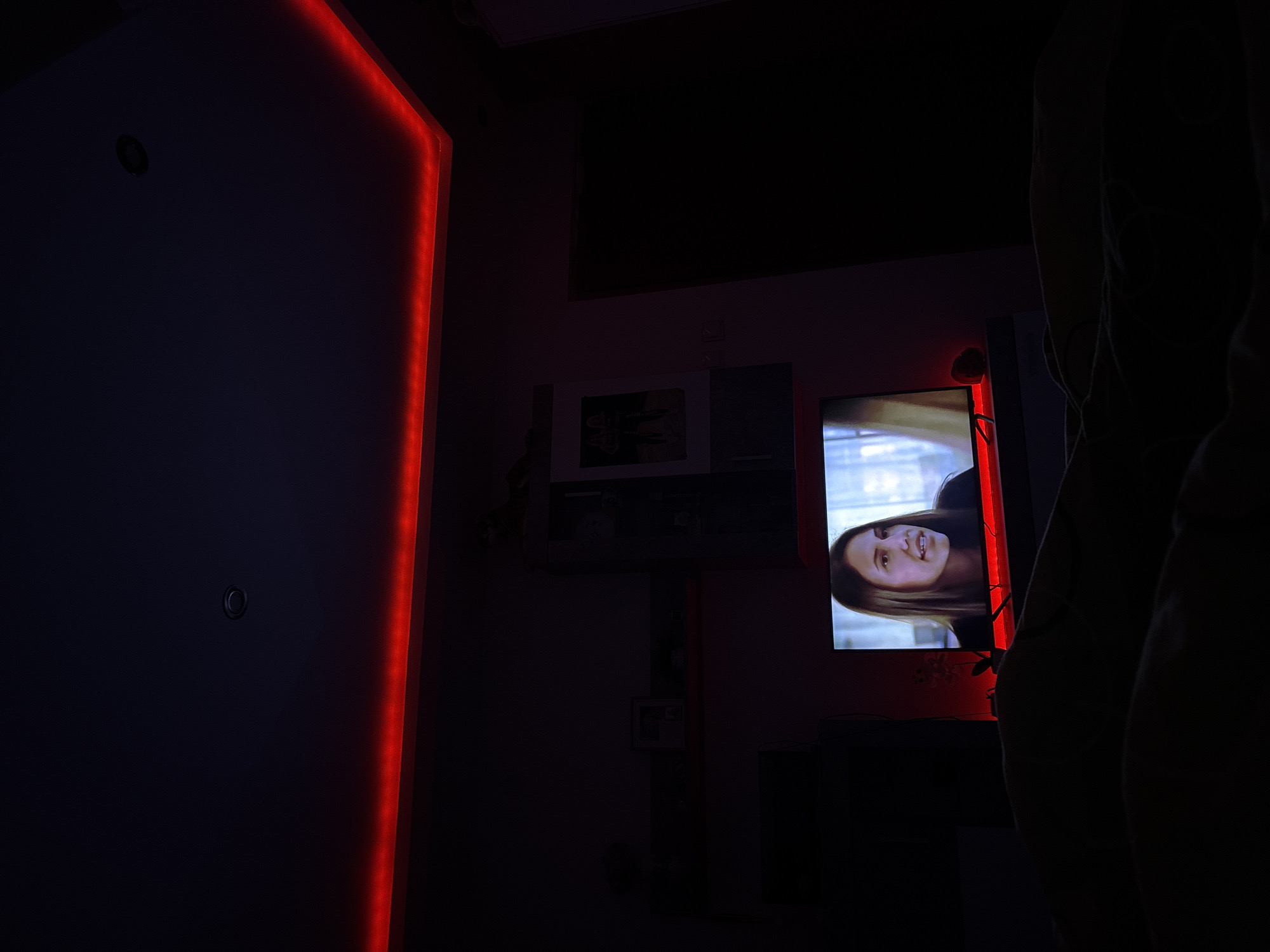 This image depicts a dimly lit interior room, specifically identified as being in Kresna, Bulgaria. The perspective is low, looking upwards and forward, consistent with a viewer reclining. The primary light source within the room consists of red LED strip lights installed along the perimeter of the ceiling, casting a red glow. The ceiling itself is dark-colored and includes at least one black recessed light fixture. In the center of the frame, a flat-screen television displays a medium shot of a female individual with long, brown hair, facing towards the left side of the screen with her mouth slightly open, suggesting she is speaking or reacting. The television is positioned on a dark, low-profile media console or cabinet. To the left of the television on the console, a dark, indistinct object, possibly a small plant, is visible. To the right of the television, a small, red-illuminated, spherical object is present. The walls are dark and largely obscured by shadow, but faint outlines of wall-mounted shelves and framed items are discernible above and to the left of the television. A tall, dark cabinet stands to the immediate right of the television, and further to the right, a dark door frame is visible. The foreground of the image consists of dark, textured material, consistent with bedding or a blanket. No other individuals are present in the observable room.