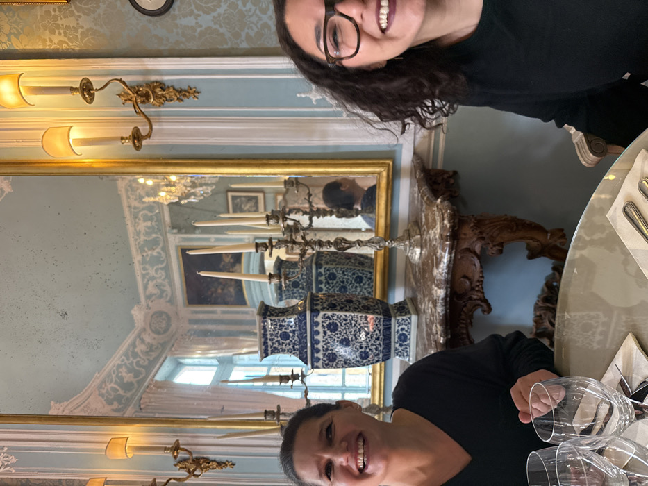 The image depicts an opulent interior dining scene, likely a restaurant, located in Aix-en-Provence, France. Two women are seated at a round, clear glass-topped table in the foreground. The woman on the left, with dark hair pulled back and wearing a black v-neck top, smiles broadly towards the camera, with her left hand resting near the table. The woman on the right, partially visible on the far right, has dark curly hair, wears dark-framed glasses, and a black top; she is also smiling, showing teeth and dark lipstick. The table is set with multiple clear wine glasses on white napkins, alongside metal cutlery. In the midground, an ornate marble-topped console table with heavily carved wooden legs, indicative of Baroque or Rococo style, serves as a display surface. It holds a tall, square blue and white ceramic vase adorned with intricate floral patterns, and a silver-toned candelabra containing several unlit white taper candles. The background features a large, rectangular, gold-framed mirror dominating a wall adorned with light blue wallpaper displaying subtle vertical stripes and floral motifs. The mirror reflects a portion of the room, revealing light blue walls with white decorative rococo-style plasterwork, a window with sheer curtains, a dark-framed painting, and a multi-tiered crystal chandelier. The mirror's surface shows signs of age with dark speckling. Ornate brass wall sconces with illuminated, candle-shaped lights and small fabric shades are mounted on the walls. A reflection of the back of a person's head and shoulders is visible in the mirror, positioned behind the console table.
