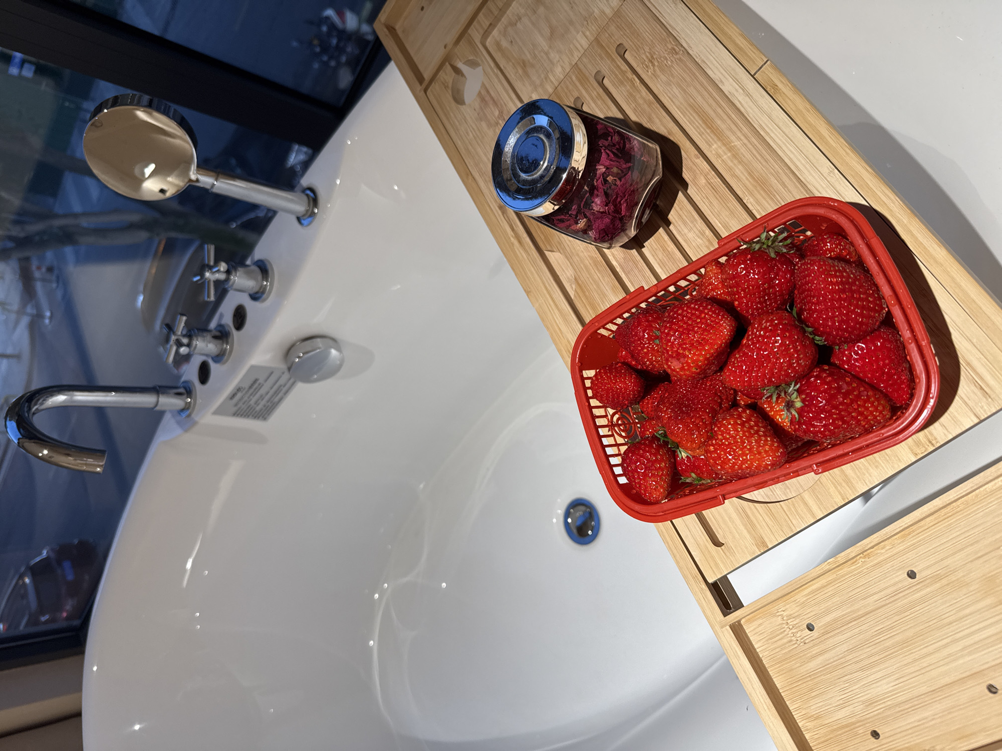 The image depicts an indoor scene in a bathroom in Wulingyuan, China, centered on a white, modern bathtub. The bathtub is equipped with chrome fixtures, including a curved faucet, two cross-handle controls for water temperature, and a handheld showerhead mounted on the rim. A light-colored wooden bathtub caddy or tray rests across the width of the tub. On this caddy, a red plastic perforated basket filled with approximately two dozen fresh, bright red strawberries is positioned to the left. To the right of the strawberries, a clear glass jar with a silver, reflective lid contains a quantity of dried, reddish-purple rose petals. Through a large window to the right and above the bathtub, an urban street scene is visible in the background, featuring a dark-colored SUV or similar vehicle, blurred trees, and other indistinct structures under what appears to be daylight conditions. No individuals are present in the scene.