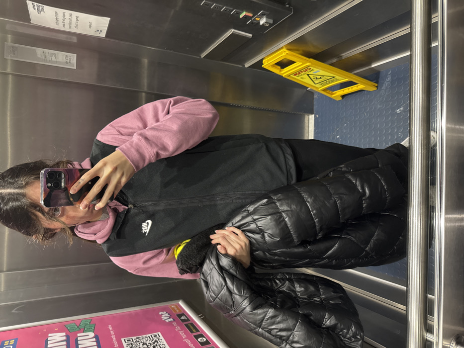 A person in an elevator takes a selfie with a phone. They wear a pink hoodie under a black Nike vest, and hold a puffy black jacket. A yellow "Caution Wet Floor" sign is visible in the upper right corner. Metal elevator doors and control panels are also visible. An advertisement is visible on the bottom left of the scene.