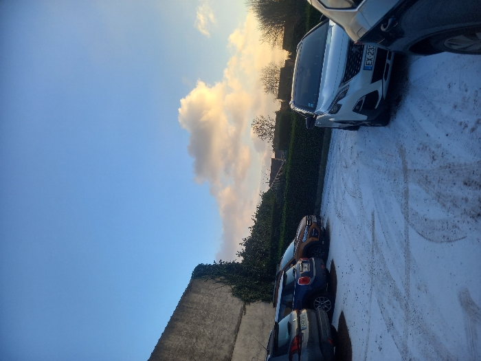 This image depicts a parking area in Noyelles-sous-Lens, France, covered in a thin, uneven layer of snow or frost. The ground displays numerous tire tracks in the snow. In the left background, a rough-textured concrete wall, partially obscured by climbing ivy, extends upwards. Adjacent to this wall, running across the mid-ground, is a well-maintained green hedge, beyond which distant residential rooftops and bare deciduous trees are visible against the horizon. A flock of small dark birds is visible in flight above the hedge on the left side. Several vehicles are parked in the lot. From left to right: * A dark grey SUV, its rear facing the viewer, with a French license plate "SS-425-BS". * A dark blue compact car, its rear facing the viewer, with a partially visible French license plate beginning "FZ-255". * An orange SUV, positioned behind the blue compact car, its rear-right quarter visible. * A white Peugeot 3008 SUV, parked angled towards the viewer on the right, displaying a French license plate "EX-233-XJ". * The front-right corner of a dark-colored vehicle is partially visible in the extreme foreground on the right. The sky occupies the upper half of the image, presenting a clear blue hue that transitions to a warmer, yellowish-orange tone near the horizon on the right, indicating either sunrise or sunset. A cluster of illuminated, white and orange-tinged cumulus clouds is present in the upper right quadrant of the sky. No individuals are present in the scene, and no overt actions or interactions are depicted.