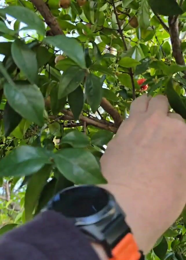 A person picks a small, round, red cherry from a tree. The tree has shiny green leaves and small, round, yellow cherries. The person's wrist has a black watch on it. The person is wearing a black sweater. The background is green with some blue from the sky.
