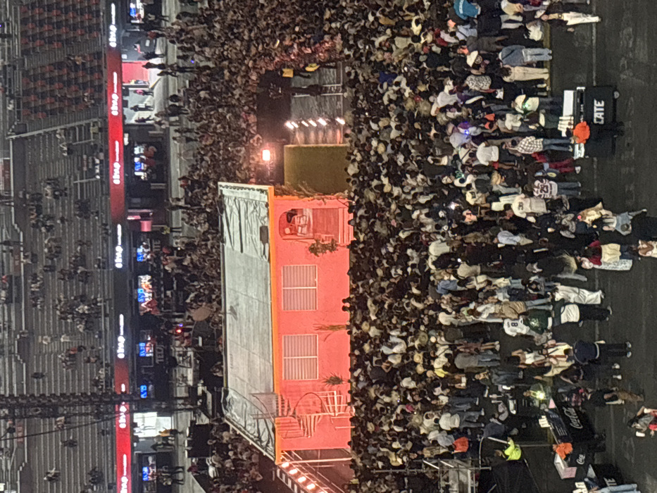 A large crowd surrounds a stage set designed to resemble a brightly lit, multi-story building. The crowd is densely packed in front of the stage, spilling out into the open area. Seating on the left side of the image is partially occupied. Various structures, including speaker systems and beverage carts, are situated near the audience.