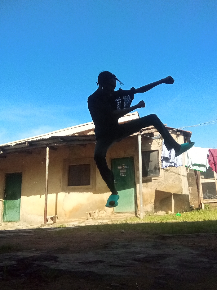 - "The image depicts a person in mid-air, silhouetted against a clear blue sky, performing a dynamic jump or kick pose in front of a residential building in Narayi, Nigeria" by FM-MK4F03, licensed under CC BY 4.0