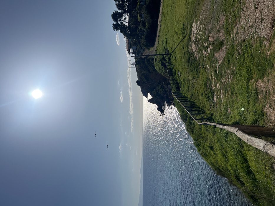 This image depicts a sunny coastal landscape located within the Kassandra Municipal Unit, Greece. The scene is dominated by a clear, light blue sky in the upper half, featuring a bright, intense sun with visible lens flare in the upper-center-right quadrant. Two birds are captured in flight against the sky in the upper-left. The left half of the image is occupied by the sea, displaying a deep blue hue that shimmers with strong sunlight reflections extending towards the horizon. Distant landmasses are faintly visible along the far horizon across the water. Along the right side of the sea, a rocky coastline or cliff face, covered in vibrant green vegetation, extends into the midground. A prominent rocky outcrop juts into the water from this cliff. In the foreground, a grassy slope slopes downward towards the cliff edge. A wooden fence, constructed from rough log posts and wire mesh, runs along the cliff's perimeter, separating the grassy area from the drop-off to the sea. To the right of the fence, a dirt path or track ascends gently towards the background. In the upper-right background, a building with a red-tiled roof is partially visible amidst several dark green evergreen trees. A single utility pole stands vertically adjacent to the path on the right side. No human subjects are present in the scene.