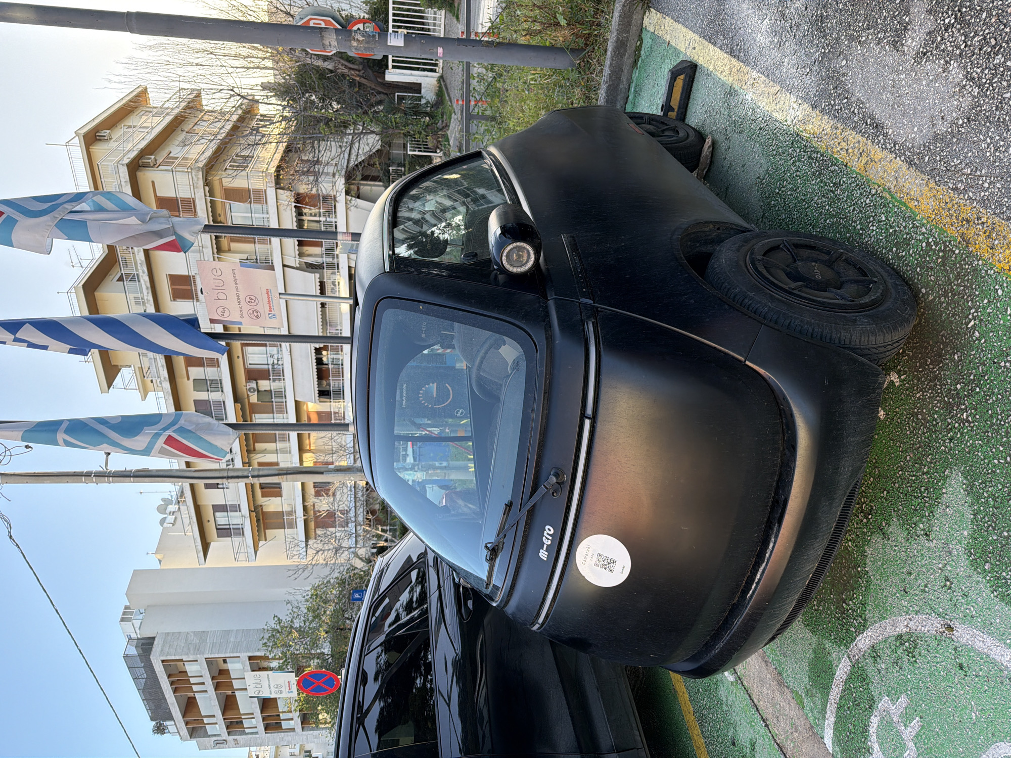 A matte black Microlino electric microcar is parked in a designated green-painted electric vehicle charging spot, marked with a white symbol and yellow curb line, in Glifada, Greece. A yellow and black wheel stop secures the rear tire. The microcar displays "m-cro" branding on its front and wheels, along with a white circular sticker containing a QR code and "Camaraki LIFE" text. A single windshield wiper is visible. The circular headlights are integrated into the side mirrors. To the immediate left, a portion of a black SUV is parked. The background features two multi-story buildings: a modern structure with light-colored and wood-paneled facades and balconies on the left, and an older, yellowish-beige apartment building with brown shutters and external air conditioning units on the right. Prominently displayed on a pole behind the microcar is a blue "e-blue" sign indicating "Θέσεις ΜΟΝΟ για φόρτιση" (Positions ONLY for charging) for cars and scooters, with "ΔΕΗ" (Public Power Corporation) and "Δήμος Γλυφάδας" (Municipality of Glyfada) mentioned, confirming the location and purpose of the parking spot. This sign is situated between three flagpoles, one flying the Greek national flag and two flying light blue flags with white wavy patterns and a red stripe. Bare-branched deciduous trees and green shrubs are visible in the mid-ground. On the right, a dark utility pole features a red circular "no parking/stopping" sign. No people are present in the scene. The lighting suggests clear daytime conditions.