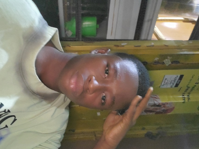 A person with dark skin and short black hair is positioned against a yellow surface. The individual wears a light-colored t-shirt. One hand is near the face, while a green object and white panels are visible in the background, along with a window. The image is taken at an angle, making the scene slightly askew.