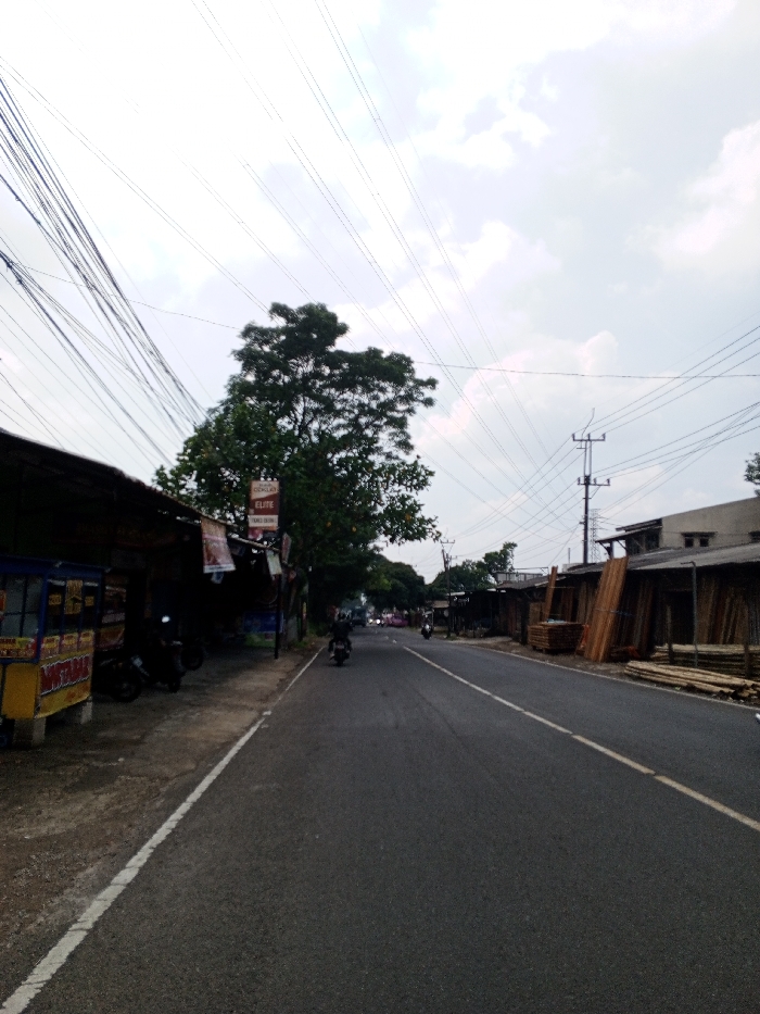 A wide-angle exterior view depicts a street in the city of Multhan, India, under an overcast sky. The dark grey asphalt road features a continuous white line on the left edge and a dashed white/yellow line in the center, extending into the distance with a slight right curve. Numerous electrical wires and power lines crisscross the sky above. On the left side of the road, a dirt and gravel shoulder borders a series of low-rise structures with open fronts. In the foreground, a blue and orange stall or pushcart, partially labeled "MIE AYAM" and "KOFTA BAR", is visible. Several motorcycles are parked beneath the overhangs of these structures. A prominent brown vertical sign displays text including "COKLAT," "ELITE," and "ES TEH CUMI." A large tree with dense green foliage stands behind these buildings. Two individuals on motorcycles, wearing dark clothing, are visible on the road, heading away from the viewer. On the right side of the road, a series of commercial structures, possibly timber yards or building material suppliers, display stacks of cut lumber and bamboo poles. A utility pole with multiple crossarms and wires is visible mid-ground. Further down the road, additional buildings and distant structures, including a transmission tower, are discernible.