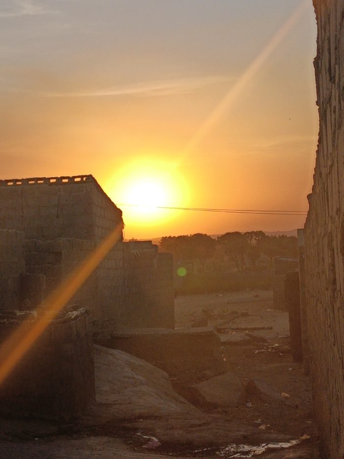 A bright sun sets over a desolate landscape, partially obscured by the silhouetted remains of blocky, ruined structures