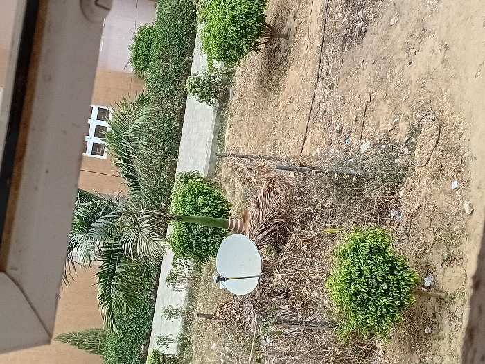 The image depicts an outdoor scene in the city of Kwazailewa, Nigeria, observed from an elevated vantage point, possibly a window or balcony, with a light-colored overhang partially obscuring the top of the frame. The foreground comprises dry, reddish-brown earth scattered with small rocks and debris, including a black cable or hose snaking across the lower-right section. A small, round-canopied green bush stands in the lower-left. A rudimentary fence line, constructed from stakes and tangled with dry, brown vegetation and trash, stretches horizontally across the midground. A white satellite dish is mounted on a pole near the left center, partially surrounded by this dry foliage. Beyond the fence, a neatly maintained landscape is visible, featuring a paved pathway running horizontally across the background. A palm tree with a slender trunk and green fronds stands centrally, flanked by numerous green bushes and hedges. To the far left, a tall, slender coniferous tree is visible. In the upper right, a light-brown building with multiple white-framed windows is partially observed behind the vegetation. No individuals are present in the scene. The environment appears dry, suggesting arid conditions or a dry season.