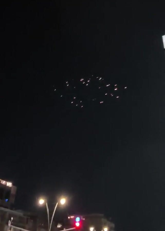At night, the video shows a cluster of lit-up objects in the sky, visible as bright spots against the dark background
