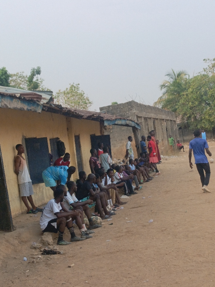 This image captures an outdoor scene in Akwanga, Nigeria, featuring a gathering of approximately 20-25 individuals, predominantly young males, positioned along a dirt path adjacent to two low-rise buildings