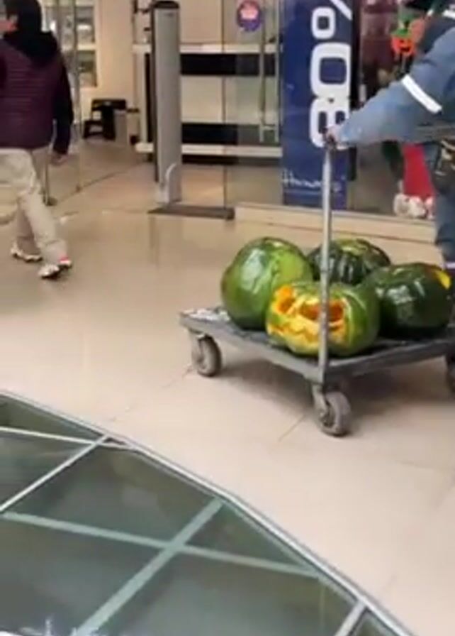 two men in blue work uniforms pushing a small cart with five green pumpkins inside a shopping mall. One of the pumpkins on the cart has been carved with a face. The cart rolls along a tile floor, passing a trash receptacle and a large glass-covered opening in the floor. Other people are walking in the background.