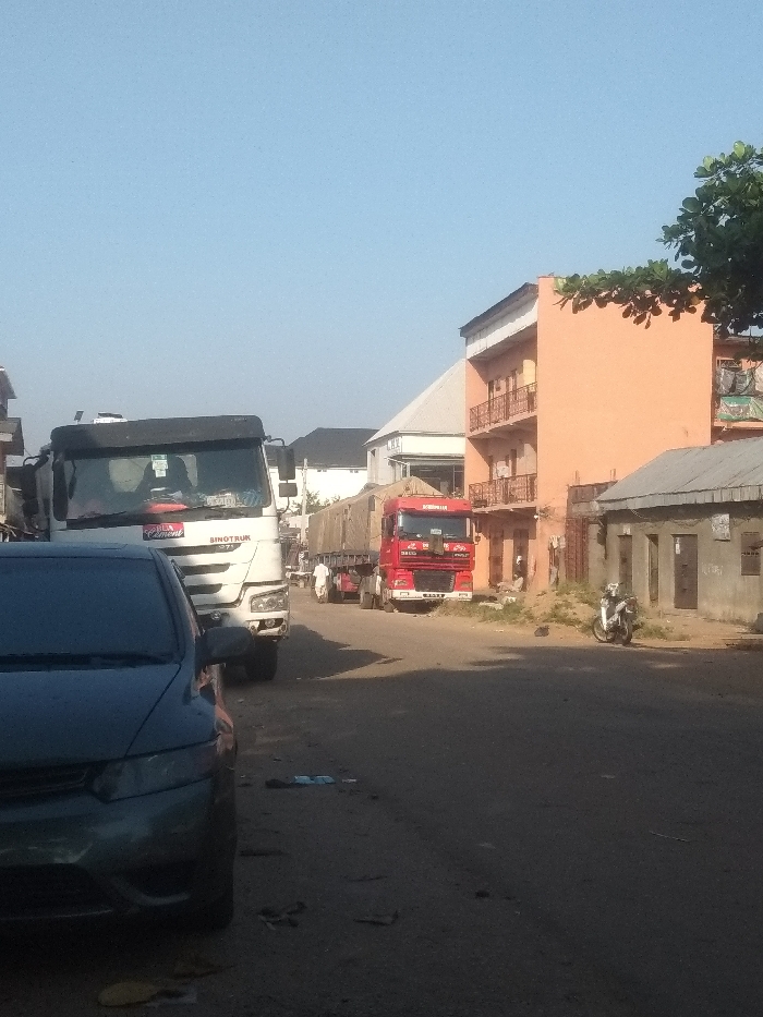 This image depicts a street scene in Maiburiji, Nigeria. In the immediate foreground, a dark grey sedan is parked on the left side of a paved road. Behind it, a white SINOTRUK heavy-duty truck, displaying a 'B&M Cement' logo, is also parked on the left. Further down the road, a red IVECO heavy-duty truck, with 'CATERPILLAR' branding visible, is stationary on the right. Its flatbed trailer is loaded with several large, light-colored bales or sacks. A lone individual, dressed in light-colored clothing, stands on the road near the front of the red truck. On the right side of the road, a white motorcycle is parked in front of a single-story building with grey walls and a corrugated metal roof. Adjacent to this, a three-story building with an orange-painted facade features dark metal balconies on its upper two levels. In the background, other structures are visible, including a multi-story building with a distinctive grey sloped roof. The sky is clear blue. The paved road surface shows scattered debris.