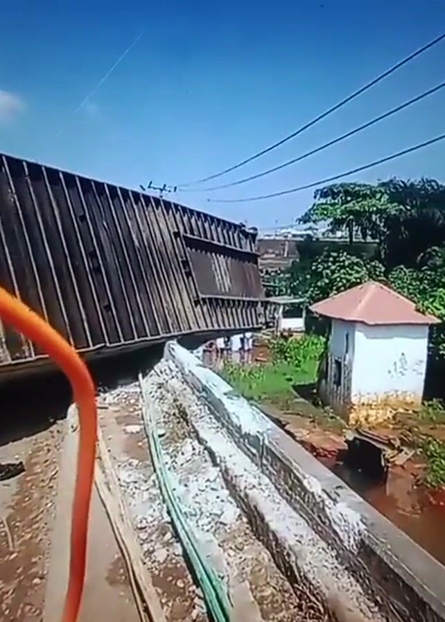 The scene shows a damaged bridge on a bright, sunny day. A large, dark-colored truck is precariously tilted off the edge of the bridge, leaning to its right. Debris from the bridge is scattered along the side. In the distance, several people appear to be standing or wading in a body of water beneath the bridge. A small, white building with a red roof is visible near the water's edge. Power lines stretch across the clear blue sky above. A thick, orange cable is visible in the foreground, obscuring part of the bridge.