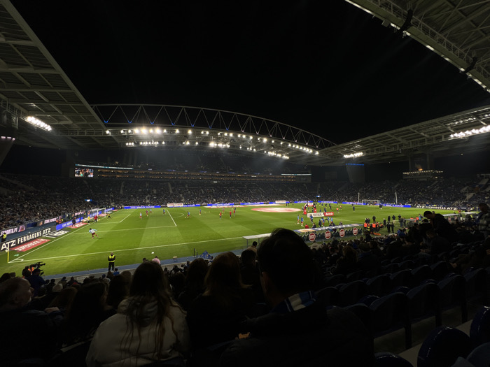 A soccer stadium is packed with people, likely during a game, as seen from a seat in the stands. The field is bright under stadium lights, illuminating players in red and blue uniforms. Banners and advertisements line the field. Spectators fill the rows of seats, their silhouettes visible in the foreground, creating a sense of depth. The structure of the stadium is expansive with large roofs and additional seating areas. The night sky is dark above.