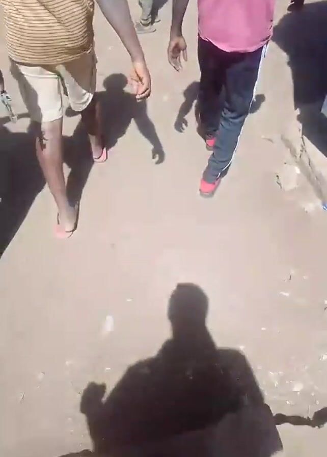 person walking along a dirt path in a village or town. The person is wearing a pink short-sleeved shirt, dark pants, and sandals, and a red hat. The person is walking past other people, including a child in a black and yellow sweater and camouflage pants. The video also shows buildings, including a corrugated metal shed. The sun is shining and casts shadows of the person and objects on the ground. The person appears to be carrying an object that may be a tool.