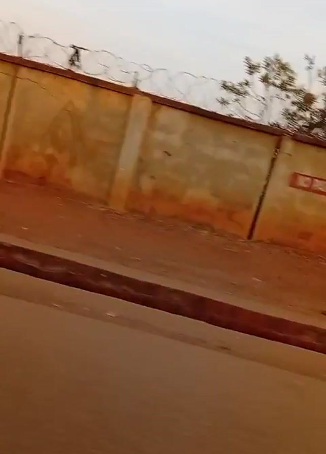 The video depicts a moving view from a vehicle, focusing on a concrete wall along the roadside. The wall is topped with barbed wire and has round and diamond-shaped decorations etched into its surface. A small tree is visible in the upper left corner. The road is dark grey.