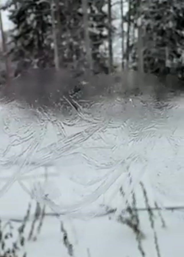 close-up view of frost on a window. Outside the window is a snowy scene, with trees and bushes visible in the background. The frost forms intricate patterns on the glass, obscuring the view of the outdoors. A scraper is used on the window removing the frost in a single vertical motion.