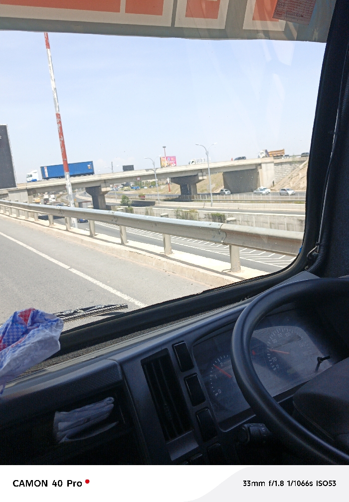 Inside a vehicle, likely a truck, a view through the windshield shows a highway overpass with vehicles on it
