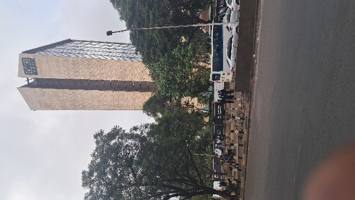 A tall, tan building with a prominent logo stands near a tree-lined street. A white bus, along with several other vehicles, is parked along the curb, where some people appear to be gathered. Posters line the street, adding to the bustling urban scene. The sky is overcast. The image is slightly rotated.