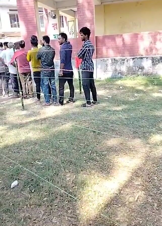 A medium shot shows a line of people outside of a building. The line is bordered by white string strung between sticks. The camera moves to a closer shot of the people in the line, focusing on the backs of their heads and clothing. The building is made of red brick and yellow-painted sections. There are some palm trees visible in the background. The line appears to be for a voting location.
