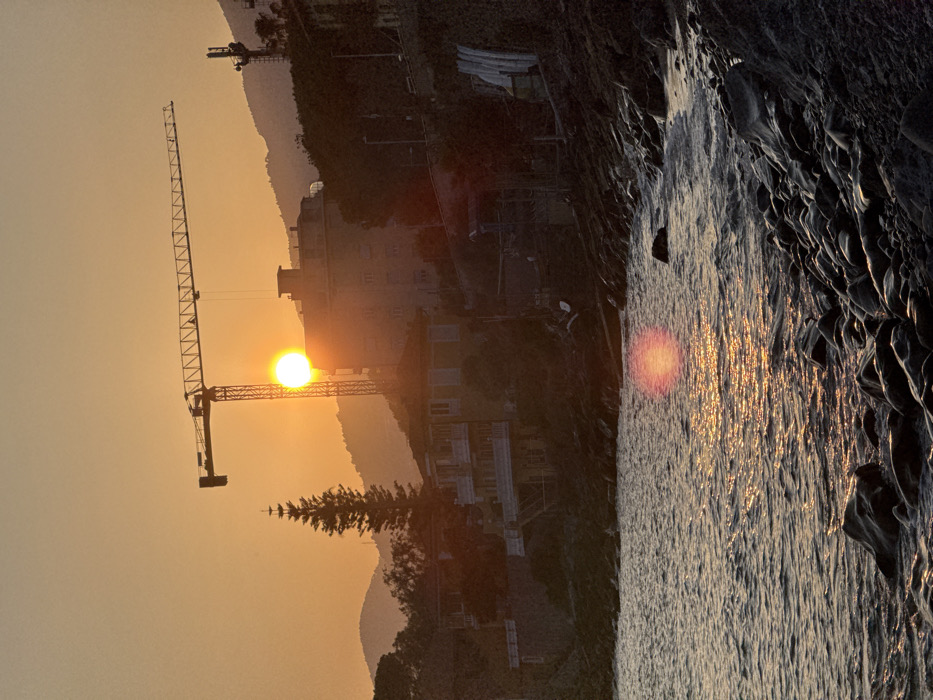 The image depicts a coastal scene in Sanremo, Italy, during a sunset. The sun, a prominent bright orange disc, is positioned in the upper center-right, partially obscured by the tower of a large construction crane, silhouetting the crane's lattice structure and horizontal jib. The sky transitions from a bright orange around the sun to a lighter yellow-orange at the top. In the foreground, the water of the sea exhibits ripples and reflections of the sun, appearing as elongated streaks of orange and pink light. A rocky shoreline, composed of numerous dark, irregular stones, occupies the bottom right quadrant. The midground features a sloped terrain rising from the coastline. Several buildings are visible, including multi-story structures with balconies, primarily silhouetted or dimly lit against the sunset. A tall, slender evergreen tree stands to the left of the crane tower, its outline distinct against the sky. Further right, another building appears taller, and a utility tower with antenna-like structures is partially visible on the hillside. In the background, a series of hazy, dark mountain ranges extend across the horizon, also silhouetted against the ambient light. The overall illumination is low, characteristic of dusk, with strong backlighting from the setting sun. There are no individuals discernible in the image.