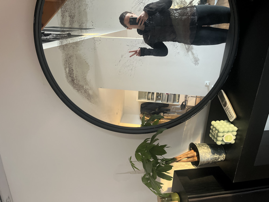 A person takes a selfie in a round mirror. The mirror reflects a hallway and furniture. A potted plant sits on a shelf below the mirror, along with a remote control and a cube-shaped candle. The mirror has a distressed or antique look, with some discoloration around the edges. The person in the reflection is wearing a dark jacket and holding up a peace sign.
