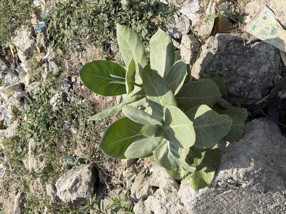 The scene in Alaguntan, Nigeria, depicts an outdoor environment characterized by an abundance of natural and anthropogenic debris under direct sunlight. The central subject is a robust, green-leafed plant, likely *Calotropis procera*, with thick, ovate leaves that exhibit a slight grey-green hue and a dusty texture, indicating an arid or dusty setting. The plant is positioned in the midground, rooted amidst a chaotic arrangement of light-colored rocks, concrete fragments, and dry soil. The ground extends into the background, where more rocks and scattered refuse are visible, including numerous crumpled plastic bags of various colors (white, black, clear, blue), suggesting discarded household or commercial waste. Sparse, dry weeds and small patches of scrub vegetation are interspersed among the rocks and debris. A fragment of a green glass bottle is partially visible in the midground. In the lower right corner, a crumpled piece of paper currency, possibly a Nigerian Naira note, lies on the ground. Strong shadows cast by the plant and rocks indicate bright, overhead sunlight. No people, animals, or specific actions are observed in the frame.