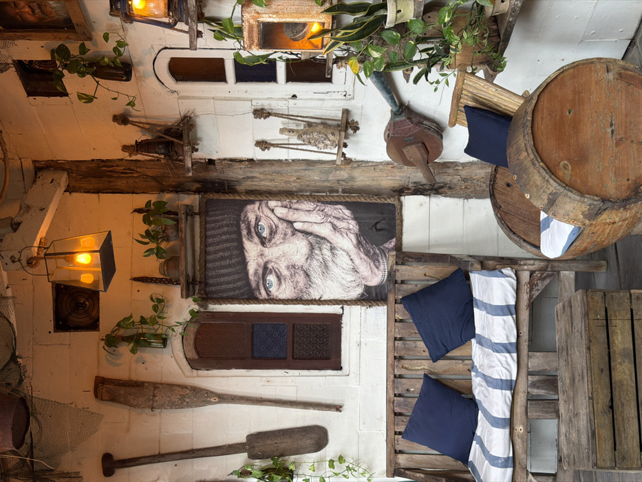 This image depicts a rustic, nautical-themed outdoor or semi-outdoor seating area, likely a cafe or restaurant in Canggu, Indonesia. The scene is presented from a slightly elevated, straight-on perspective. The primary background is a white-painted brick wall adorned with numerous decorative and functional items. On the far left, two weathered wooden paddles or oars lean vertically against the wall, flanking a small arched window with dark brown, segmented panes. Below the window, a large, rectangular portrait hangs, depicting an elderly man with a prominent white beard and blue eyes, wearing a dark knit beanie, with one hand resting against his cheek. The portrait is framed by thick rope. To the right of the portrait, an exposed, rough-hewn wooden structural beam extends vertically from floor to ceiling. To the right of this beam, the white brick wall continues, featuring another arched window with white panes. Multiple small wooden shelves are mounted on the walls, holding various potted plants, including pothos vines trailing downwards, and other decorative elements such as small wooden sculptures and an old lantern. A larger, square, amber-toned lantern with an illuminated bulb hangs from an overhead wooden beam near the top center of the frame. Below it, a circular fan unit is embedded in the wall. Further right, a rusty, rectangular lantern with an illuminated interior is affixed to the wall. Below this, a vintage wooden device, possibly a component of old machinery, is mounted on the wall. In the foreground, a rustic wooden slatted bench with a high back occupies the left side. It features a blue and white striped cushion and two solid navy blue throw pillows. In front of the bench, a small, wooden crate serves as a table. On the right, a unique chair fashioned from a repurposed wooden barrel is visible, also fitted with a blue and white striped cushion and a single navy blue throw pillow. The overall environment suggests a casual, eclectic, and weathered aesthetic, possibly evoking a maritime or fishing village theme. No people are present in the scene, and no specific actions or interactions are depicted.