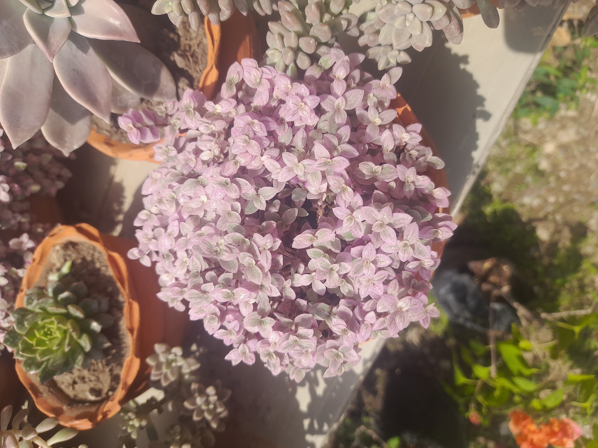 The image presents a top-down view of several potted succulents. The dominant subject is a pot filled with a Callisia repens 'Pink Panther', characterized by its small, pink and green variegated leaves. Other succulents, including an Echeveria with pale lavender leaves and a small, green rosette succulent, are visible in terracotta pots to the left. The pots sit on a light-colored surface, likely a ledge or table. The outdoor setting is suggested by sunlight and glimpses of green foliage and a faded orange flower in the background. Based on the prompt the location is Tinaquillo, Venezuela.