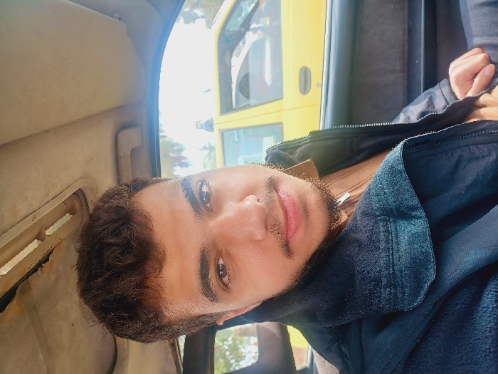 A young adult male is depicted in a close-up, front-facing photograph taken from inside a vehicle