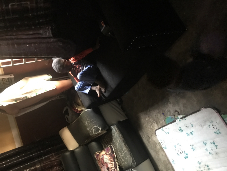 This image depicts an interior scene in Oba-Ile, Nigeria, possibly a living area, characterized by dim lighting and a worn appearance
