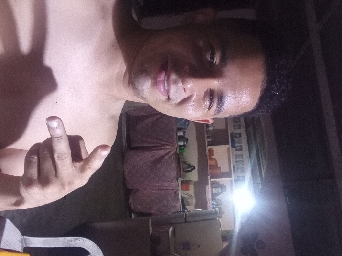 A shirtless man faces the camera with a slight smile, holding up his hand in a gesture. His hair is short and dark. Behind him, a room is visible with shelves holding various items. The lighting is dim, and the overall image appears to be taken indoors with a low-quality camera, giving the scene a slightly grainy look.