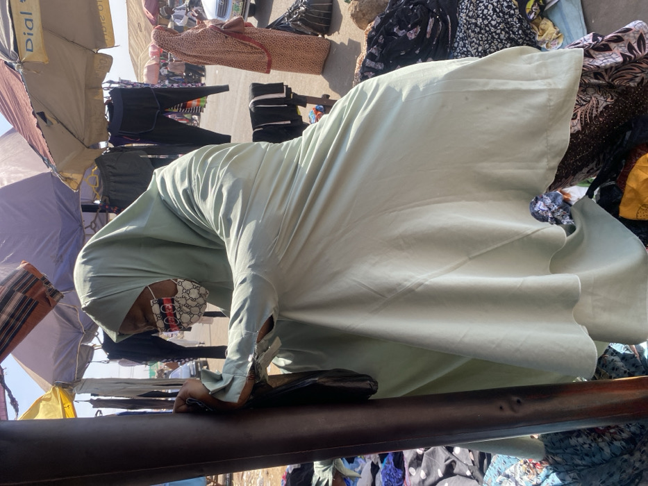 The image captures an outdoor market scene in Sabon Gari South, Nigeria, under clear, bright daylight. In the foreground, a woman in a light green abaya and matching hijab stands with her left hand gripping a dark brown vertical pole. She wears a white face mask adorned with a repeating red and black 'GG' pattern. A black bag is suspended from her left wrist. Around her feet and to the left, piles of various folded and loose textiles and clothing are visible on the ground. In the mid-ground, towards the right, another woman, dressed in a patterned light brown full-length garment, stands facing away from the camera. A light-colored vehicle is partially visible behind her, with blurred figures suggesting a busy street or market thoroughfare. Overhead, several light-colored market umbrellas, including one with "Dial" and numbers printed on it, provide shade, while various garments hang from display racks. The ground surface appears unpaved and dusty, indicative of an active outdoor market setting.