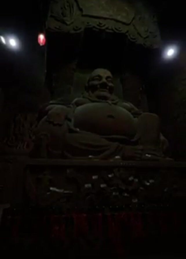 A low-angle shot shows a stone Buddha statue illuminated by two spotlights in a dimly lit room. The statue depicts a seated, smiling Buddha with a large belly. The statue sits on an ornate platform with carvings and red decorative tassels hanging down. The walls of the room are also carved with figures and designs.