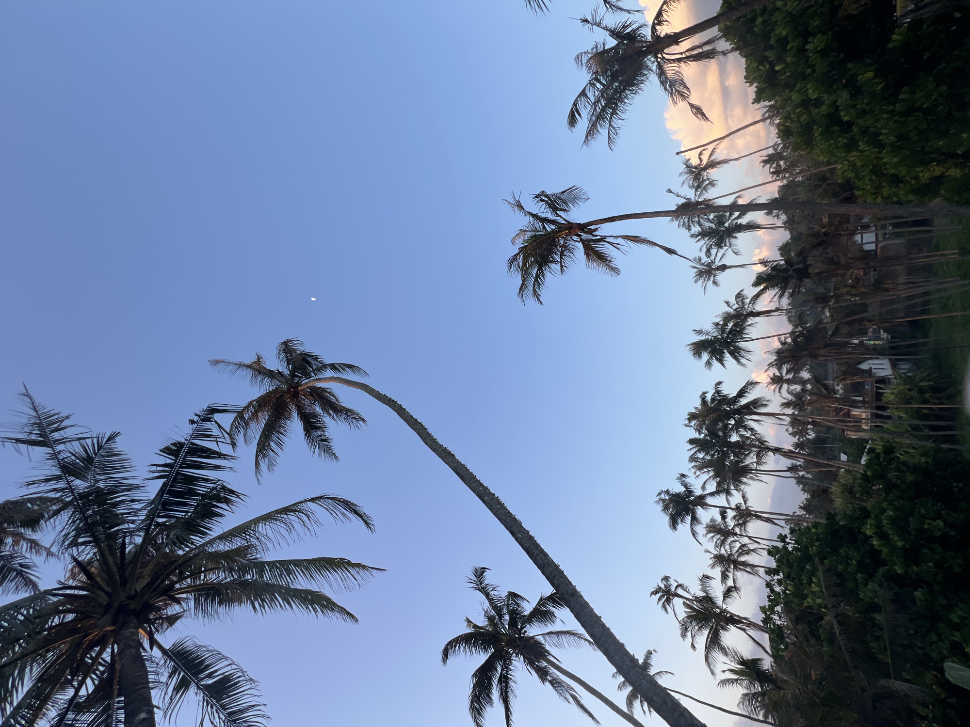 This image depicts a tropical landscape at either dawn or dusk in Goviyapana, Sri Lanka. The sky is a clear, light blue, with a slender crescent moon visible in the upper central portion. Towards the lower right horizon, faint, pink-tinged cumulus clouds are present. The foreground and mid-ground are dominated by numerous tall palm trees, primarily coconut palms, silhouetted against the sky. One particularly long, slender palm trunk extends diagonally from the lower left towards the upper right. Below the palm canopy, dense, dark green foliage is visible. In the background, nestled among a grove of palm trees, multiple multi-story structures with light-colored walls and dark roofs are partially discernible. No individuals or specific actions are visible within the frame.