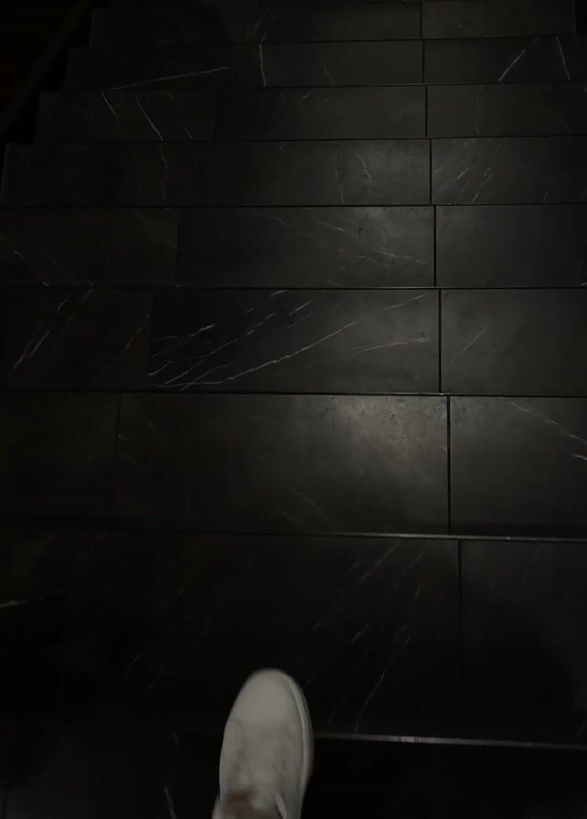 A person wearing white sneakers and dark shorts walks down a set of dark, rectangular stairs. The stairs appear to be made of a material with a dark color and a veined pattern. The lighting is dim.