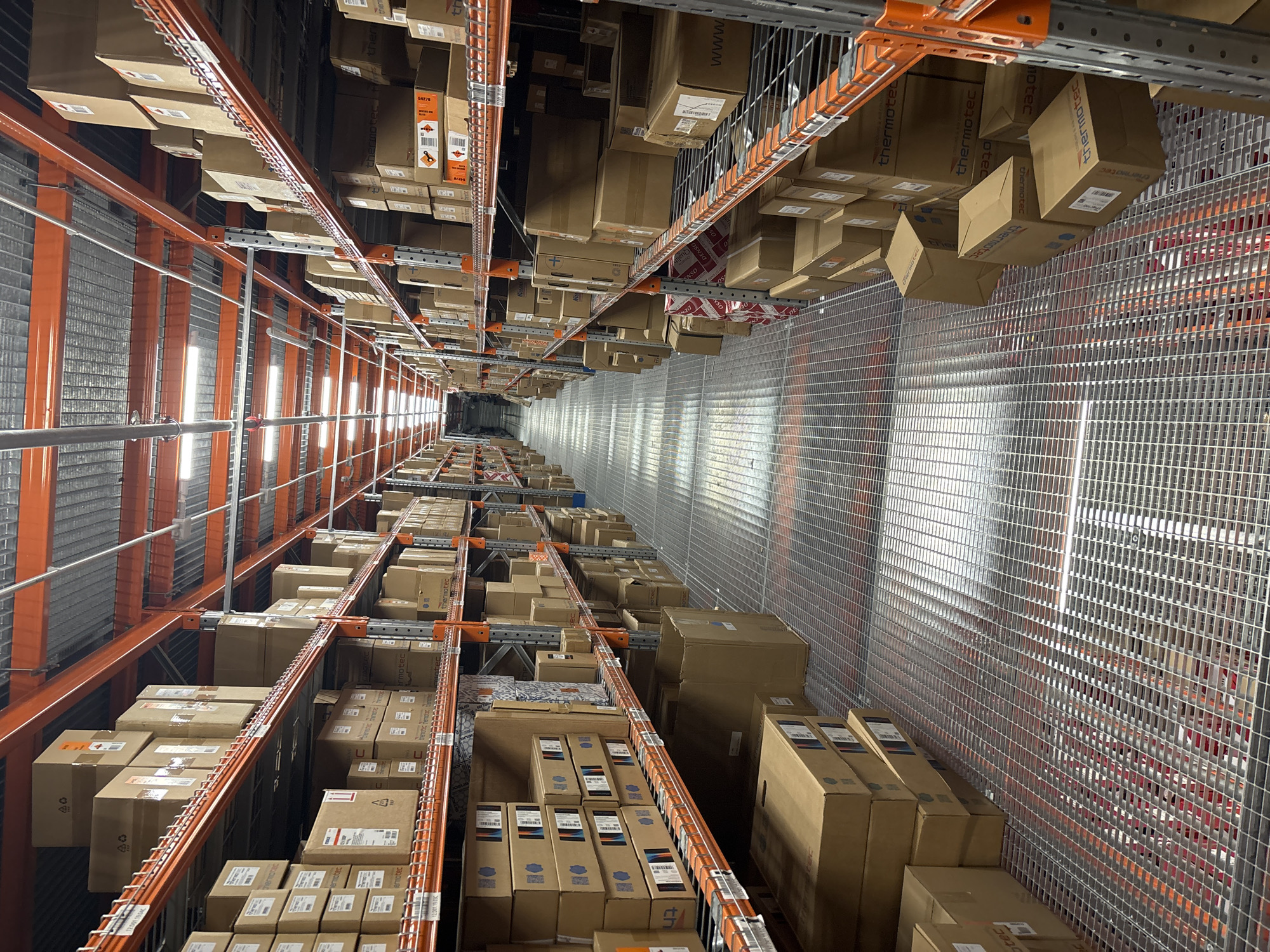 This image shows a narrow aisle in what appears to be a large storage warehouse