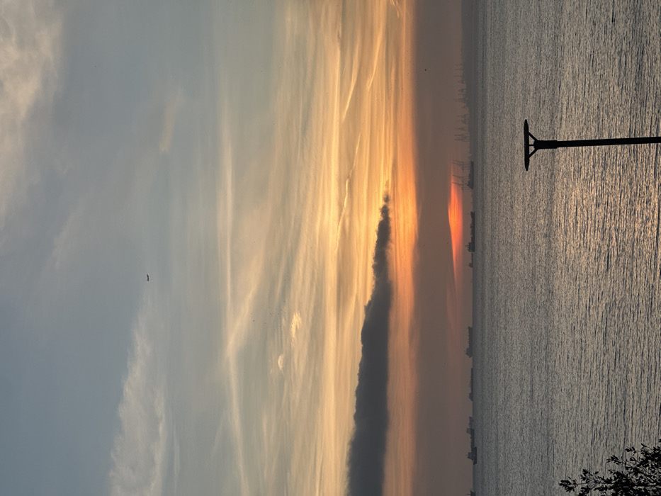 The image captures a sunset over the Marmara Sea, viewed from Bakırköy, Turkey. The sky presents a gradient from pale blue with wispy clouds at the top to vibrant orange, yellow, and red hues dominating the central and lower portions, indicating dusk. A prominent dark, elongated cloud band extends horizontally across the mid-sky. A single dark-silhouetted aircraft is visible flying in the upper-left quadrant of the sky. Multiple small dark specks, consistent with birds, are scattered across the upper sky. Along the horizon, a line of approximately ten large ships, silhouetted against the setting sun, are either anchored or moving slowly on the water. To the far right horizon, a distinct cluster of industrial cranes is visible, suggesting a distant port or industrial area. The surface of the sea is dark, with subtle reflections of the sky's light. In the foreground, the upper portion of a dark, T-shaped pole is present on the right, and dark foliage partially extends into the frame from the lower left. No individuals are depicted, nor are any direct human actions or interactions visible.