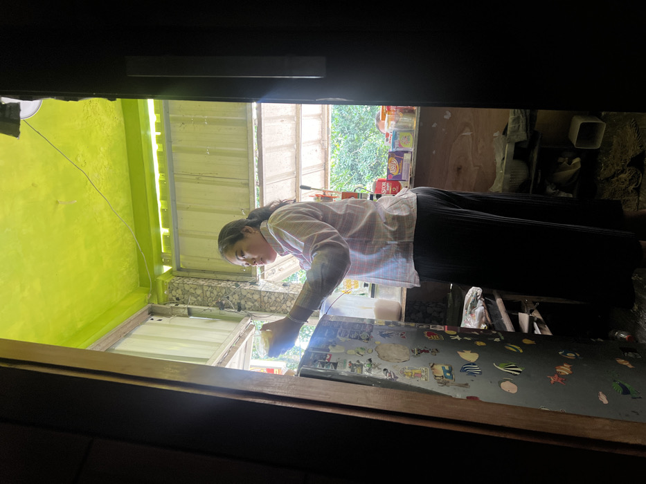 A woman, seen from a low angle, bends over in a room. She wears a pink and white checkered shirt and black pants. One hand holds a yellow object. The room's walls are a bright green and the ceiling is white corrugated metal. A refrigerator covered in stickers is in the foreground. Outside, trees and shelves of groceries are visible. The view is framed by a dark doorway.