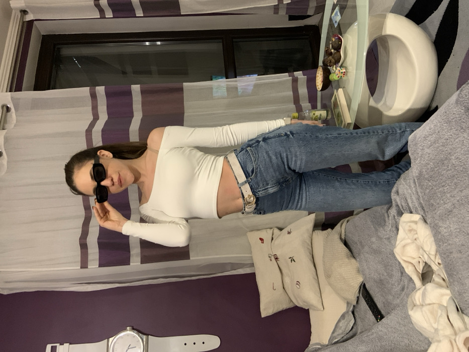 A female subject stands upright in what appears to be a residential living space in Sofia, Bulgaria. She is positioned slightly left of center, facing the viewer with her head turned, while her body is angled slightly to the viewer's left. She wears a white, off-the-shoulder, long-sleeved crop top, revealing her midriff, paired with light blue denim jeans and a white belt with a gold-toned buckle. Her right hand holds black, rectangular sunglasses near her temple. Her dark hair is pulled back. The background on the left features a solid purple wall with a large white wall clock, designed to resemble a wristwatch, mounted centrally. To the right, white sheer curtains with horizontal purple stripes cover a window, which shows a dark exterior. In the left foreground, a gray sofa or armchair is covered with a textured gray throw blanket. Stacked on the sofa are several pillows, including two beige rectangular pillows with embroidered patterns and a lighter beige ribbed pillow. A black remote control and light-colored fabric are visible on the throw. In the right midground, a modern, white, oval-shaped coffee table with a clear glass top is present. On the table, items include a small green bottle with a yellow cap, a small white book, a bowl containing light-colored snacks, a plate with several dark, irregular-shaped confectionery items, and a colorful Rubik's Cube. The floor beneath the coffee table is covered by a rug with a black and white striped pattern. The scene is illuminated by interior artificial lighting.
