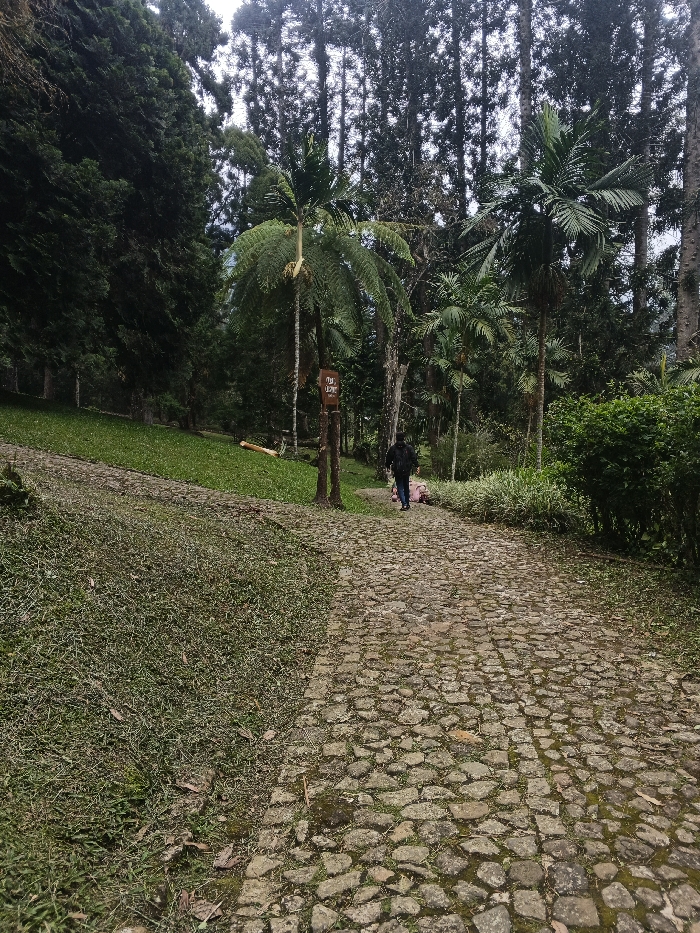 The image depicts a park scene within the city of Lalitpur, Nepal. A cobbled stone path, damp and exhibiting moss growth in areas, recedes into the background, curving slightly to the left. To the left of the path, a manicured grassy slope ascends. To the right, a lower grassy area transitions into dense green foliage and shrubs. One individual, dressed in a dark jacket, blue jeans, and dark shoes, is observed walking away from the camera along the cobbled path in the mid-ground. Further along the path and slightly to the right of the walking individual, a second person is discernible, appearing to be stooping or sitting close to the path's edge, wearing a light-colored or pink garment on their upper body. A rustic wooden signpost with a brown, rectangular sign attached stands to the left of the path, positioned between the path and the grassy slope. The text on the sign is illegible. A light-colored log lies horizontally on the grassy slope further left. The background is dominated by a dense arrangement of trees, including tall, slender conifers with dark green foliage and several palm trees with lighter green fronds. The overall lighting suggests an overcast sky.