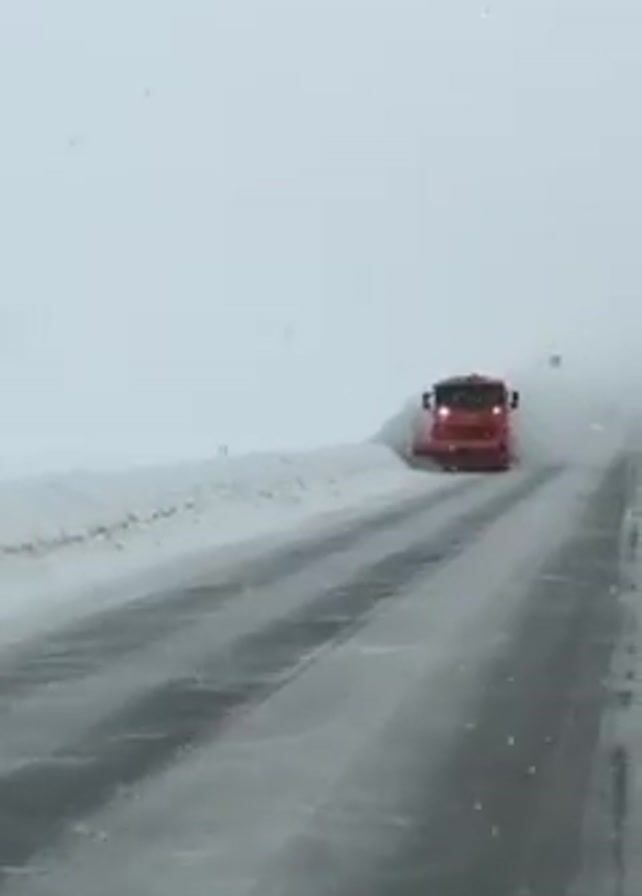 The view from inside a vehicle driving on a snowy, icy road shows a red snowplow clearing the road ahead