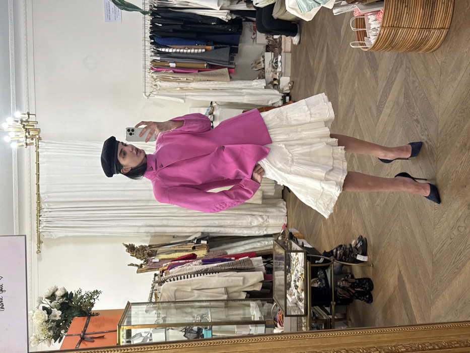 A female individual is photographed in a mirror reflection inside what appears to be a clothing boutique in Paris, France. The subject, a woman with dark, shoulder-length hair, wears a black beret, a bright fuchsia asymmetrical blazer with a high collar and structured shoulders, a tiered white ruffled skirt, and dark blue stiletto heels. She holds a light-colored smartphone with her right hand, positioned to capture her reflection, with her left hand resting on her hip. Her lips are slightly parted. The interior features a light brown herringbone parquet floor. White walls extend to a high ceiling with crown molding, from which a gold-toned chandelier with multiple candle-style lights is suspended. To the left of the woman's reflection, a large gold-framed mirror is visible. Beyond the mirror's frame, a glass display cabinet containing various items, possibly jewelry, is present. Above this cabinet, an orange gift box adorned with a brown ribbon holds white flowers and green foliage. Clothing racks filled with garments are visible on both sides of the woman's reflection. On the right, further clothing racks display items, and shoes are arranged on shelves beneath them. A person wearing dark pants and white shoes is partially visible seated in the far right background, partially obscured by a large, woven rattan basket on the floor in the foreground. White curtains or drapery line a back wall, and a small, white sign with text is affixed to the right wall.