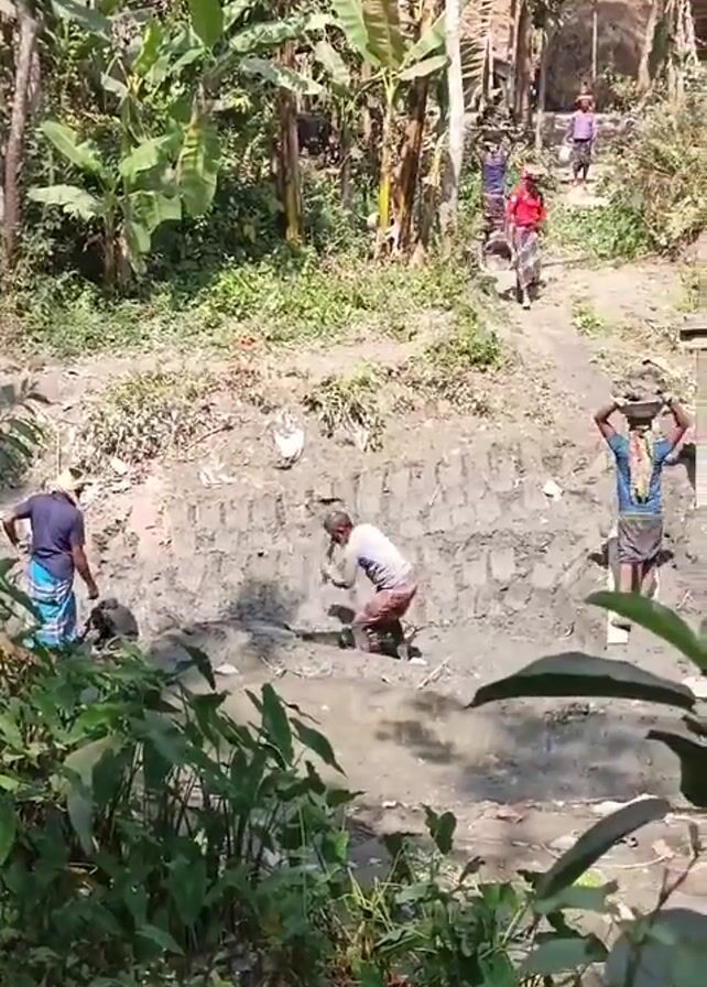 several people working near a muddy ditch in a rural, wooded area. In the foreground, a man bends over, appearing to dig in the mud with a tool. To his left, another man stands near the edge of the ditch, wearing a lungi. To his right, a man climbs a makeshift ladder, carrying something on his head. In the background, more people walk along a path leading up a small hill towards a structure that resembles a haystack or a thatched roof building. Banana trees and other vegetation are visible throughout the scene.