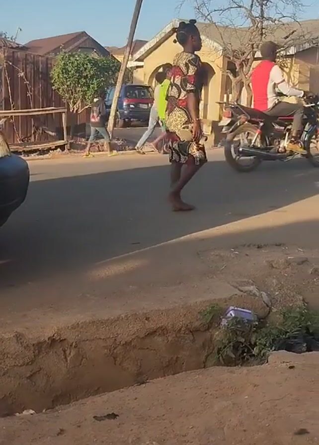 residential street with a young woman walking barefoot in the foreground. She is wearing a patterned dress. In the background, several children are walking across the street together. There are houses visible on either side of the street and a car parked nearby. There is a drainage ditch visible along the side of the street. The sky is clear and it appears to be daytime.