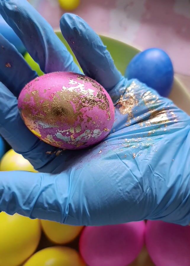 A person wearing blue gloves holds a pink Easter egg decorated with gold leaf in their left hand. The palm of the hand has gold leaf flakes on it. The egg sits over a lime green bowl containing various colored Easter eggs including yellow, pink and blue. A purple egg carton and yellow cup sit in the background. The table underneath the bowl has a light wooden grain pattern.