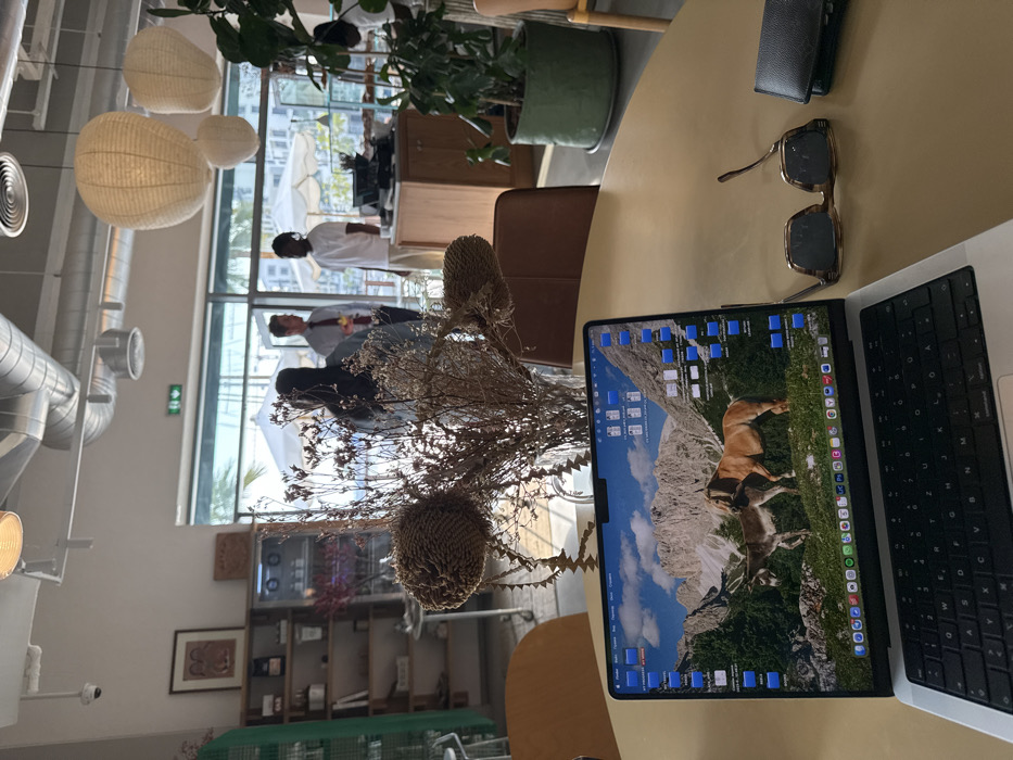 The image depicts an indoor scene within a cafe or restaurant in Dubai, United Arab Emirates, characterized by modern, airy aesthetics. In the immediate foreground, a silver laptop with an open screen rests on a light yellow round table. The laptop's display features a desktop wallpaper of a donkey and a horse standing in a mountainous, green landscape, with numerous blue folder icons scattered across the screen and a dock of application icons at the bottom. To the right of the laptop, a pair of brown-framed sunglasses and a dark wallet are placed on the table. Centered in the mid-ground, a clear glass vase holds a dried floral arrangement consisting of thin branches, small dried flowers, and several large, textured seed pods resembling dried sunflowers, partially obscuring the background. Through large windows in the background, an outdoor patio with white umbrellas is visible, beyond which modern buildings and green foliage suggest an urban environment. Inside the cafe, behind the dried flowers, multiple individuals are present. Three people are prominent near the windows: one person with dark hair, possibly wearing a head covering, in a light top, standing partially obscured; a light-haired male in a white shirt and dark tie; and another male in a white T-shirt and light trousers, standing behind a light wood counter that features a cash register or point-of-sale system. To the far left, a tall set of open wooden shelves is filled with various items, including framed pictures and packaged goods. The ceiling features exposed silver ductwork and several spherical, white paper lantern light fixtures. Potted green plants are placed around the interior space. Brown-toned seating and additional tables are also visible further back within the cafe.