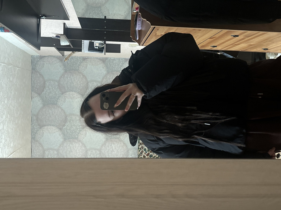 A long-haired individual, likely female, is depicted taking a mirror selfie indoors in a residence located in Severouralsk, Russia. The person wears a black puffer jacket and dark pants, with long dark hair partially covering the shoulders. The face is entirely obscured by a smartphone, held by the left hand, which displays a silver ring on the ring finger. The phone features a light-colored case with two distinct stickers on the back. Two dark hair clips are visible in the hair near the forehead. The environment reflected in the mirror includes a wall covered with light-colored wallpaper featuring a repeating circular or abstract pattern. To the right, a dark, wall-mounted shelving unit is visible, holding various objects such as a mug, bottles, and other small items. Below this unit is a light wooden dresser or chest of drawers with dark handles. A hairbrush and additional toiletries are present on the dresser's surface. A portion of a sofa or pillow with a multi-colored floral or abstract pattern is visible behind the subject's left shoulder. To the immediate left of the reflected image, a section of a light wooden door frame or wardrobe is apparent.